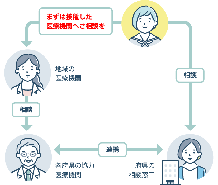 HPVワクチン接種後に気になる症状が出現した場合は、まずは接種を受けた医師・かかりつけ医師にご相談ください。各都道府県における協力医療機関での受診は、接種を受けた医師・かかりつけ医師とご相談ください。